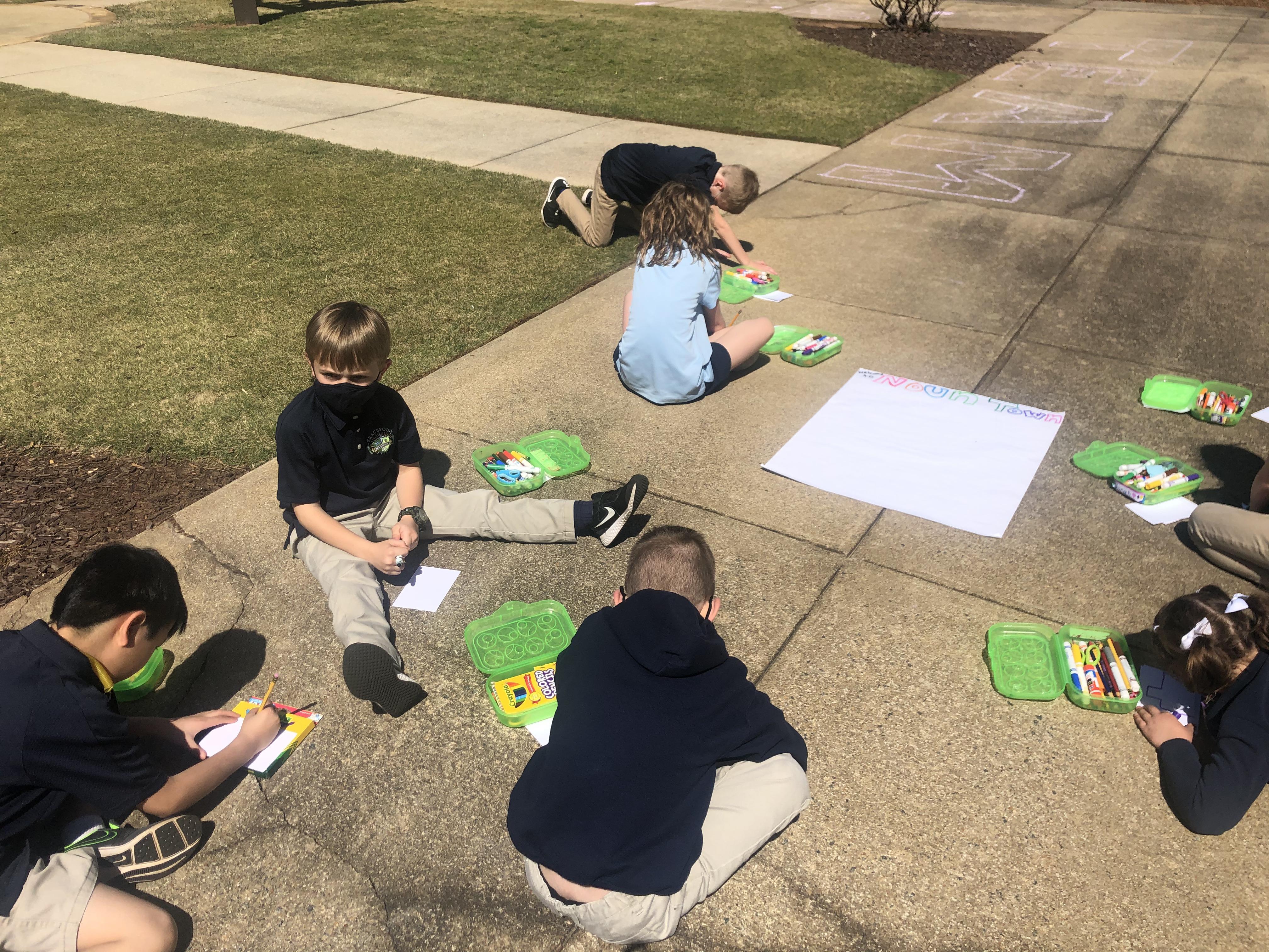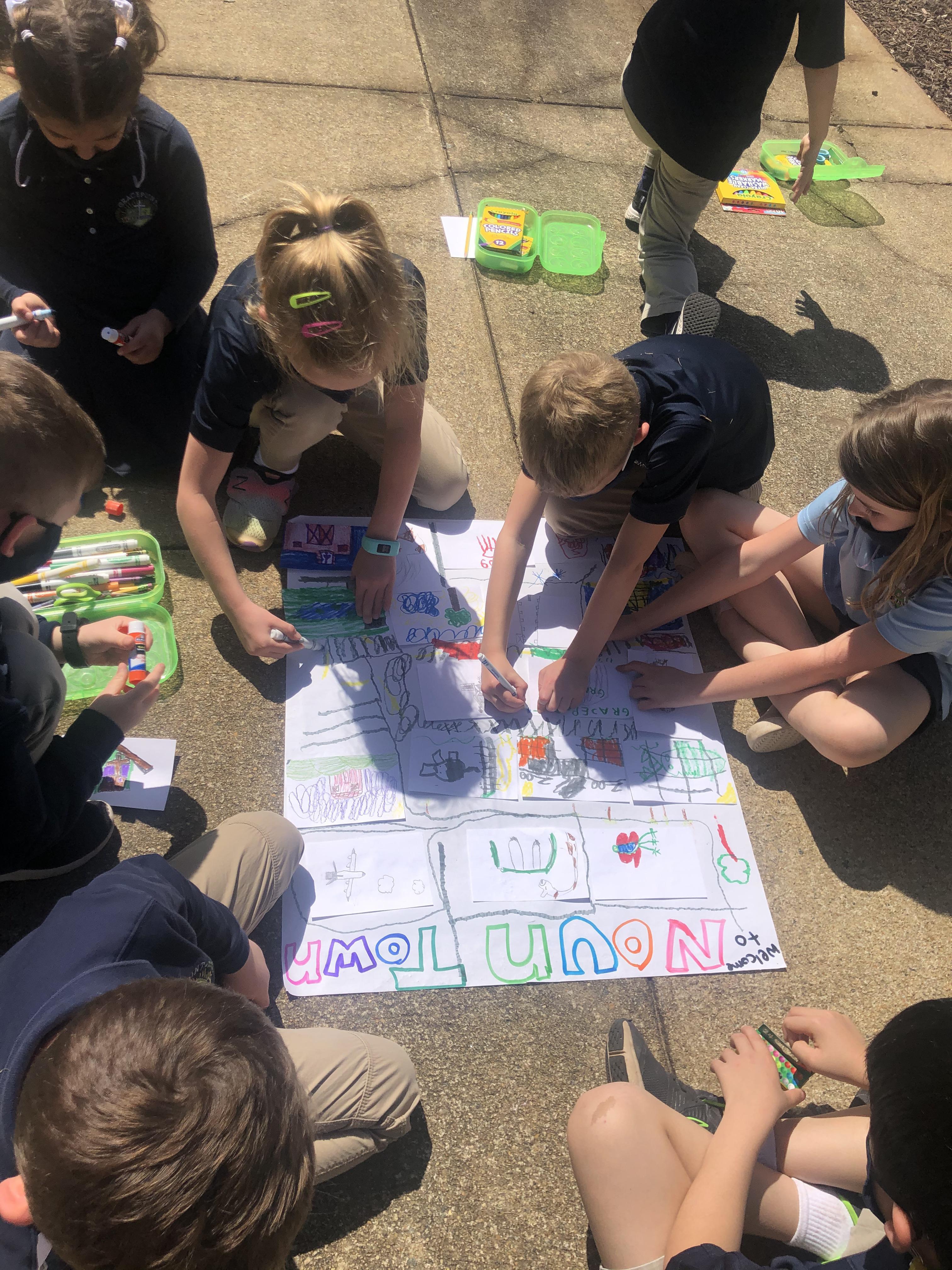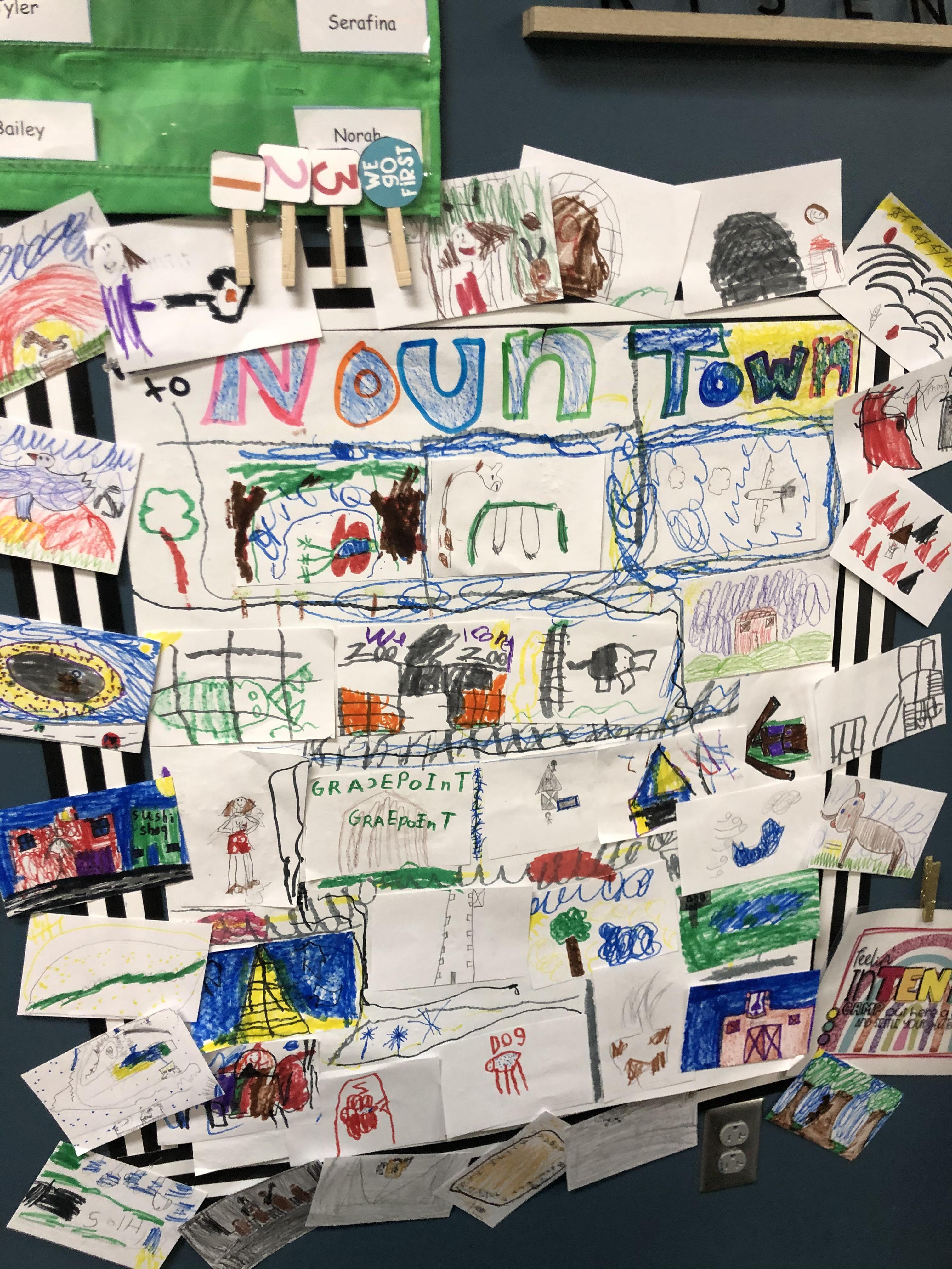 Writing class was outside today! We created our very own Noun Town! Each student was given three index cards and asked to draw a noun on each. Then, we glued all of our nouns onto chart paper and decorated our town!