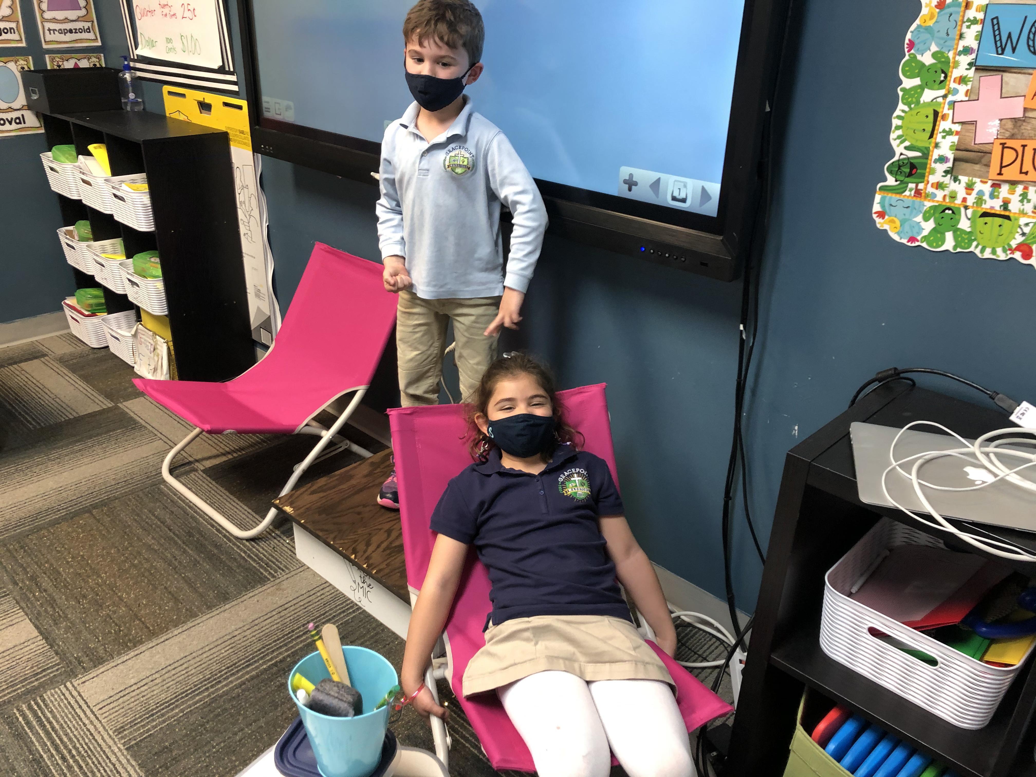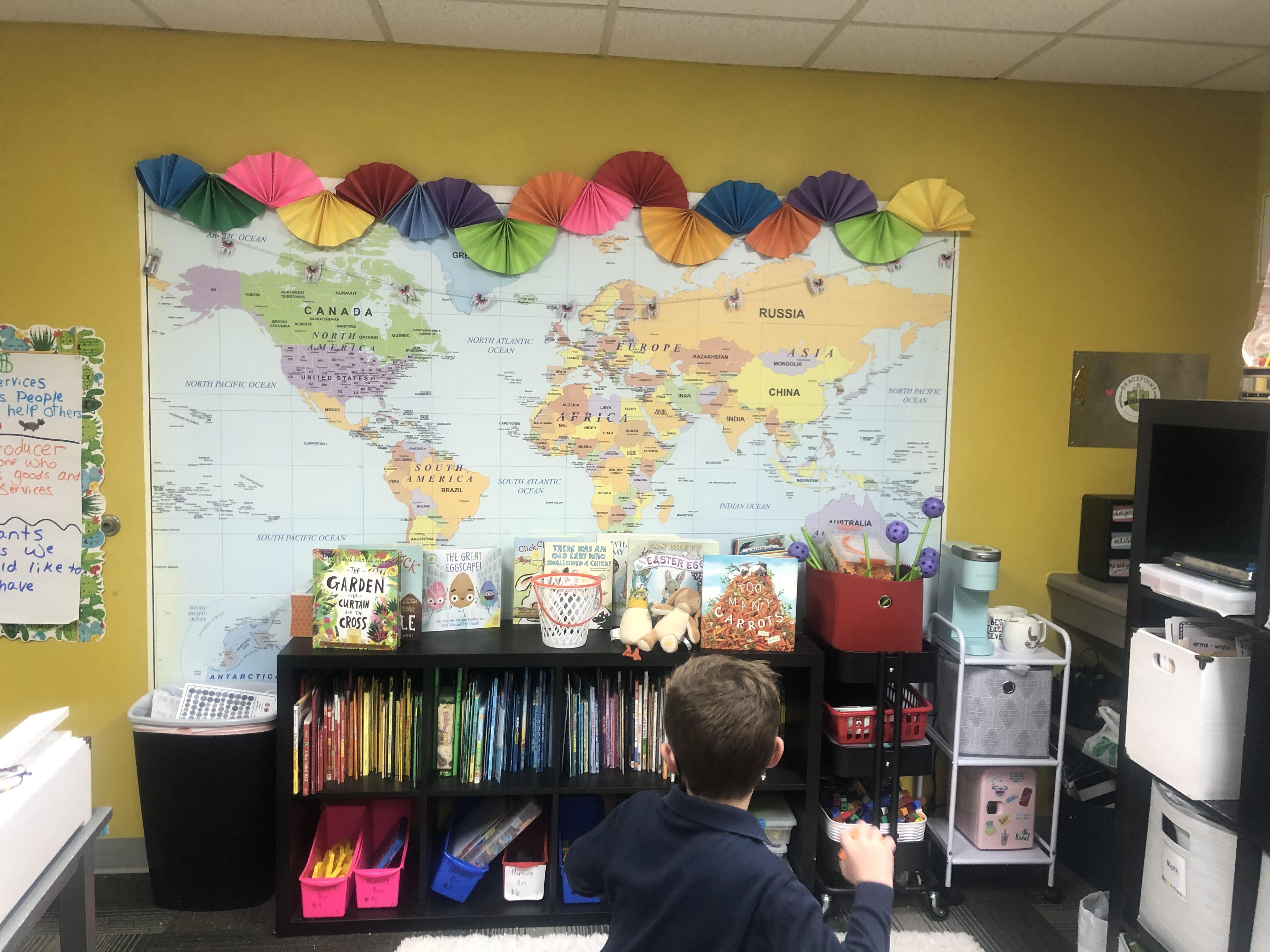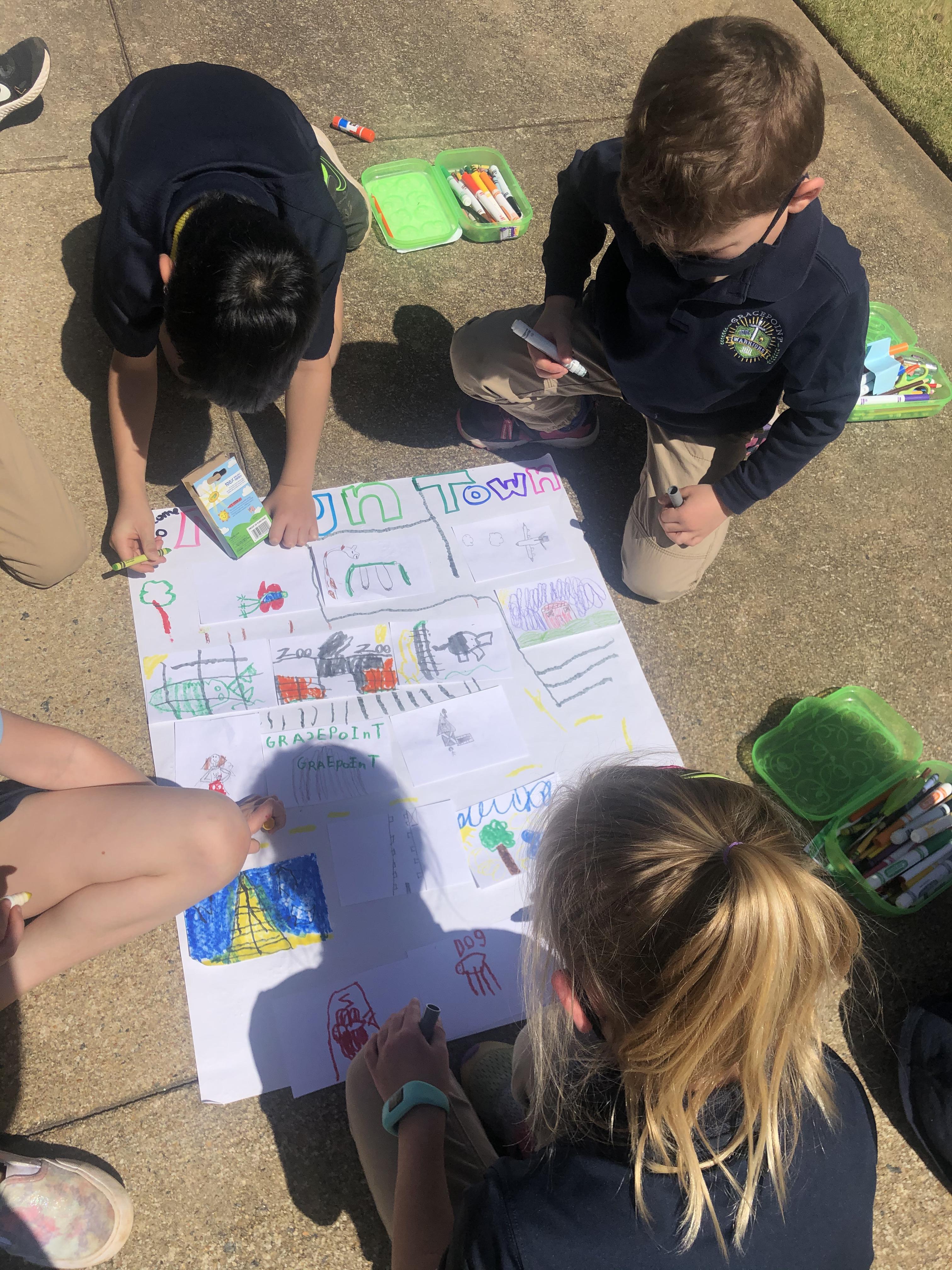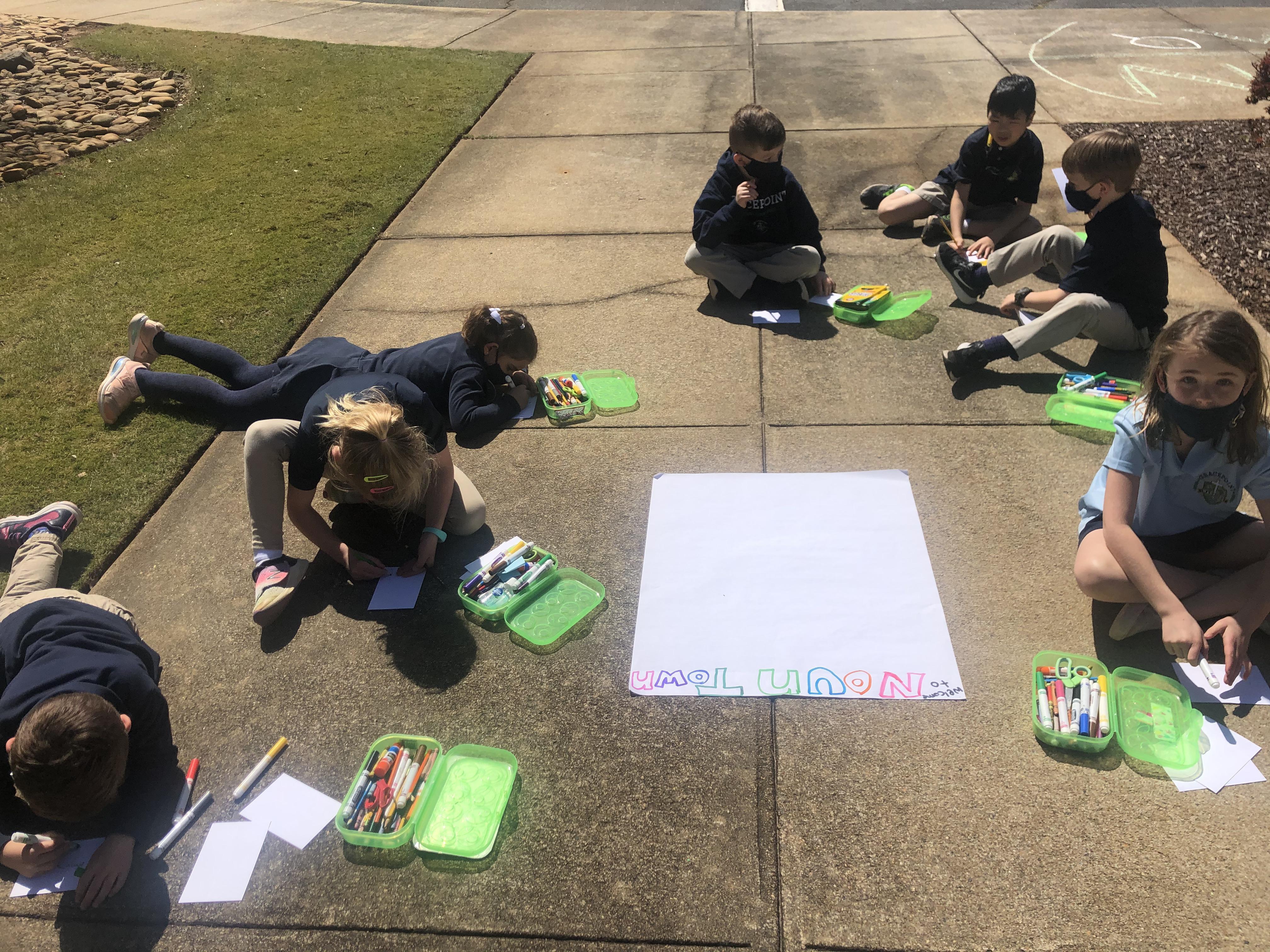Writing class was outside today! We created our very own Noun Town! Each student was given three index cards and asked to draw a noun on each. Then, we glued all of our nouns onto chart paper and decorated our town!