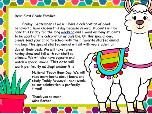 Remember tomorrow is our celebration day-bring a favorite stuffed animal to school. It is fun lunch day so no need to send a lunch to school! Just send your student with two snacks and a water bottle. There was no homework this week due to the crazy schedules, but homework will come home on Monday as usual.