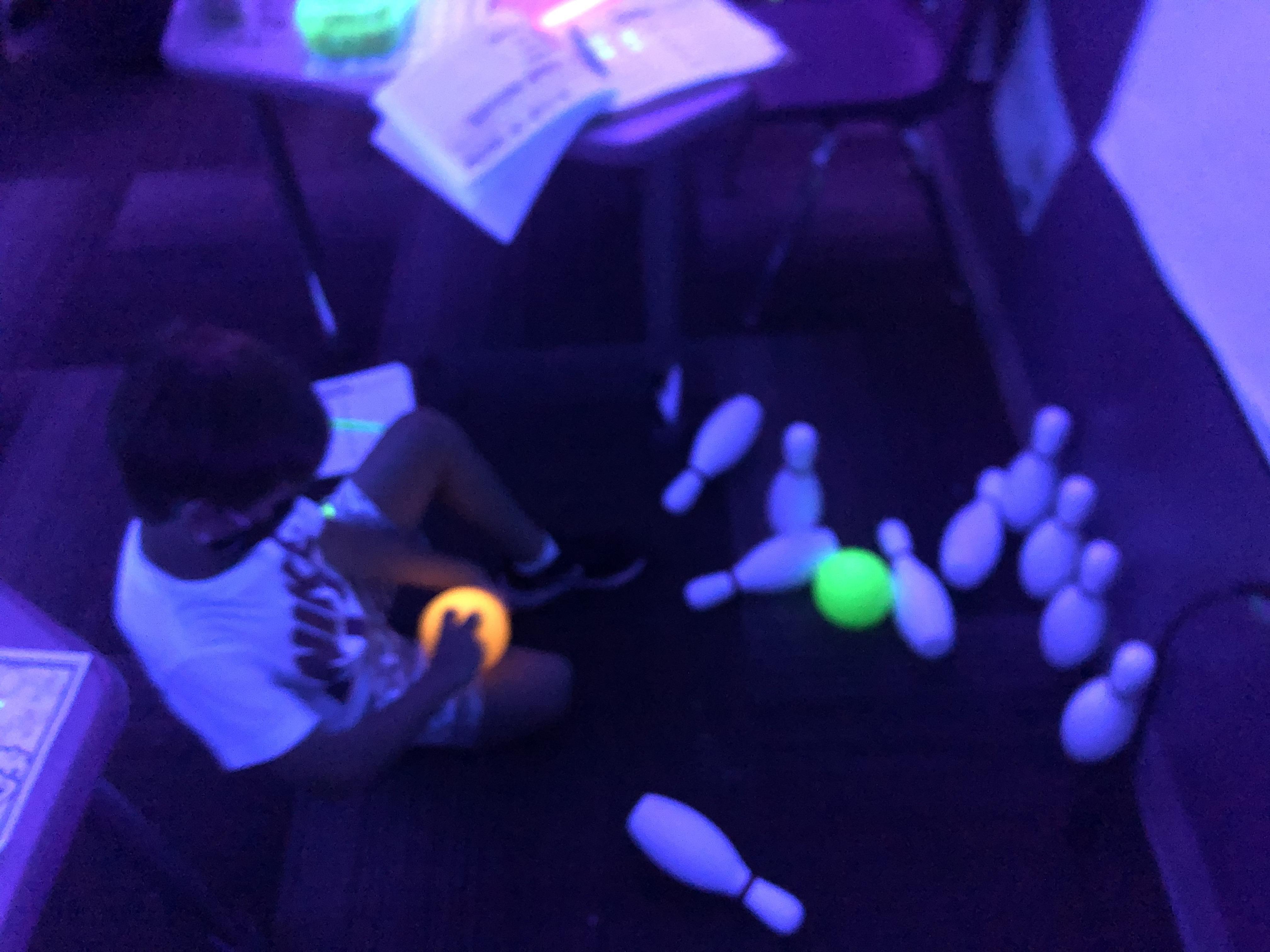 Glow day bowling: students played glow in the dark bowling and then wrote and solved subtraction problems to show how many pins they knocked down.