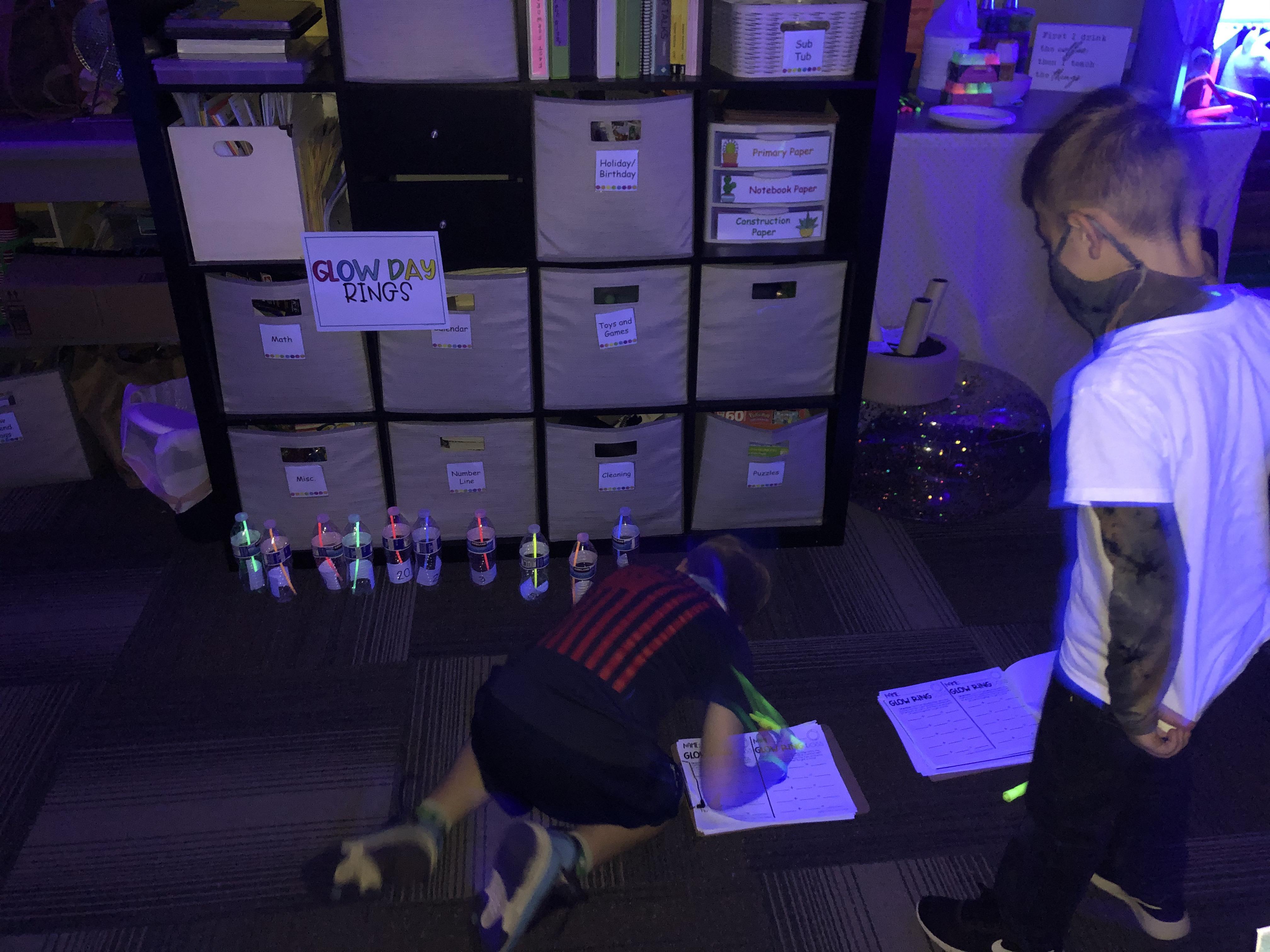 Glow day centers/math: ring toss. Students played ring toss using water bottles and glow stick rings. Each bottle had a different point value listed. They then had to write addition problems to figure out the winner of the game.