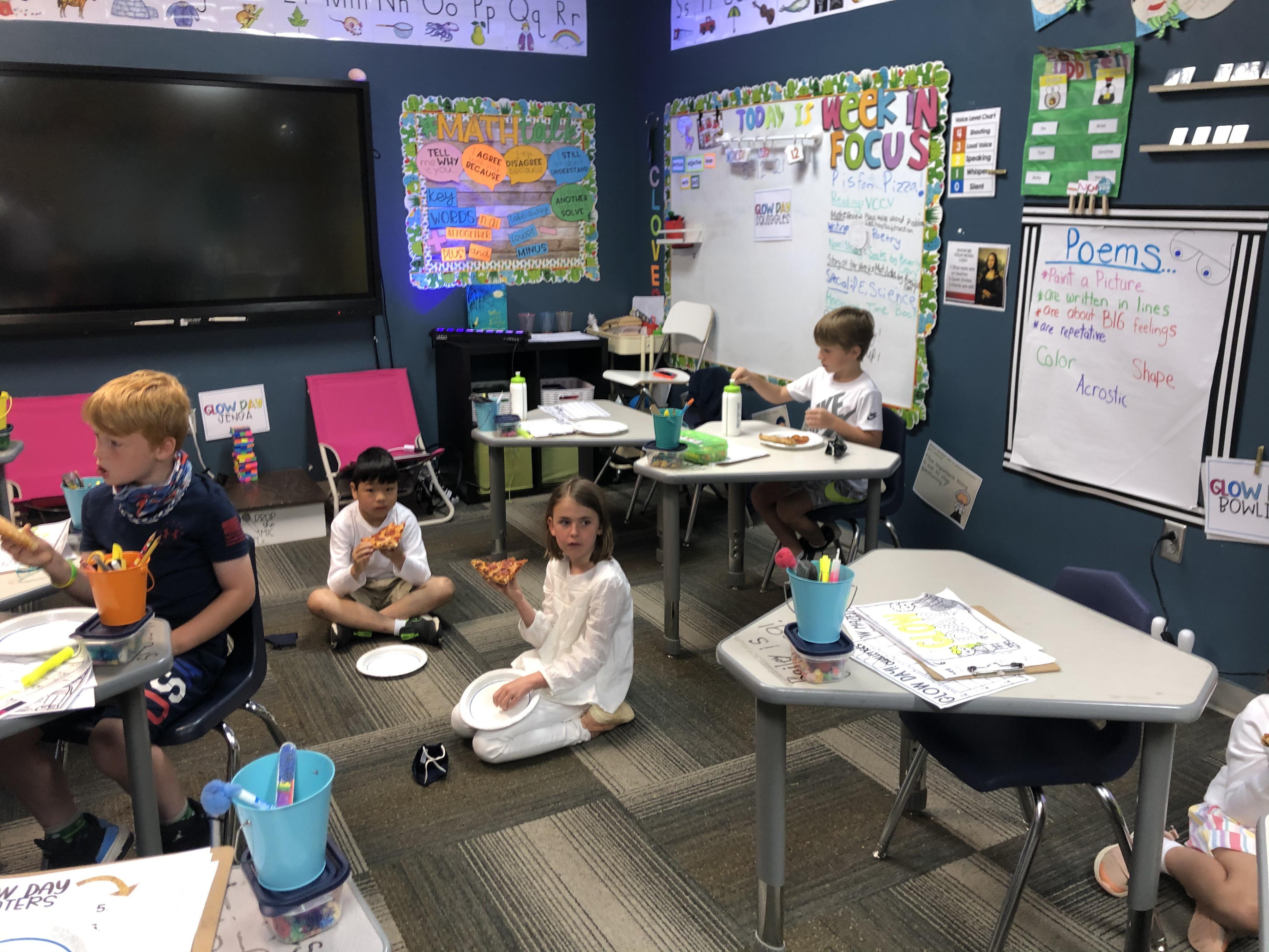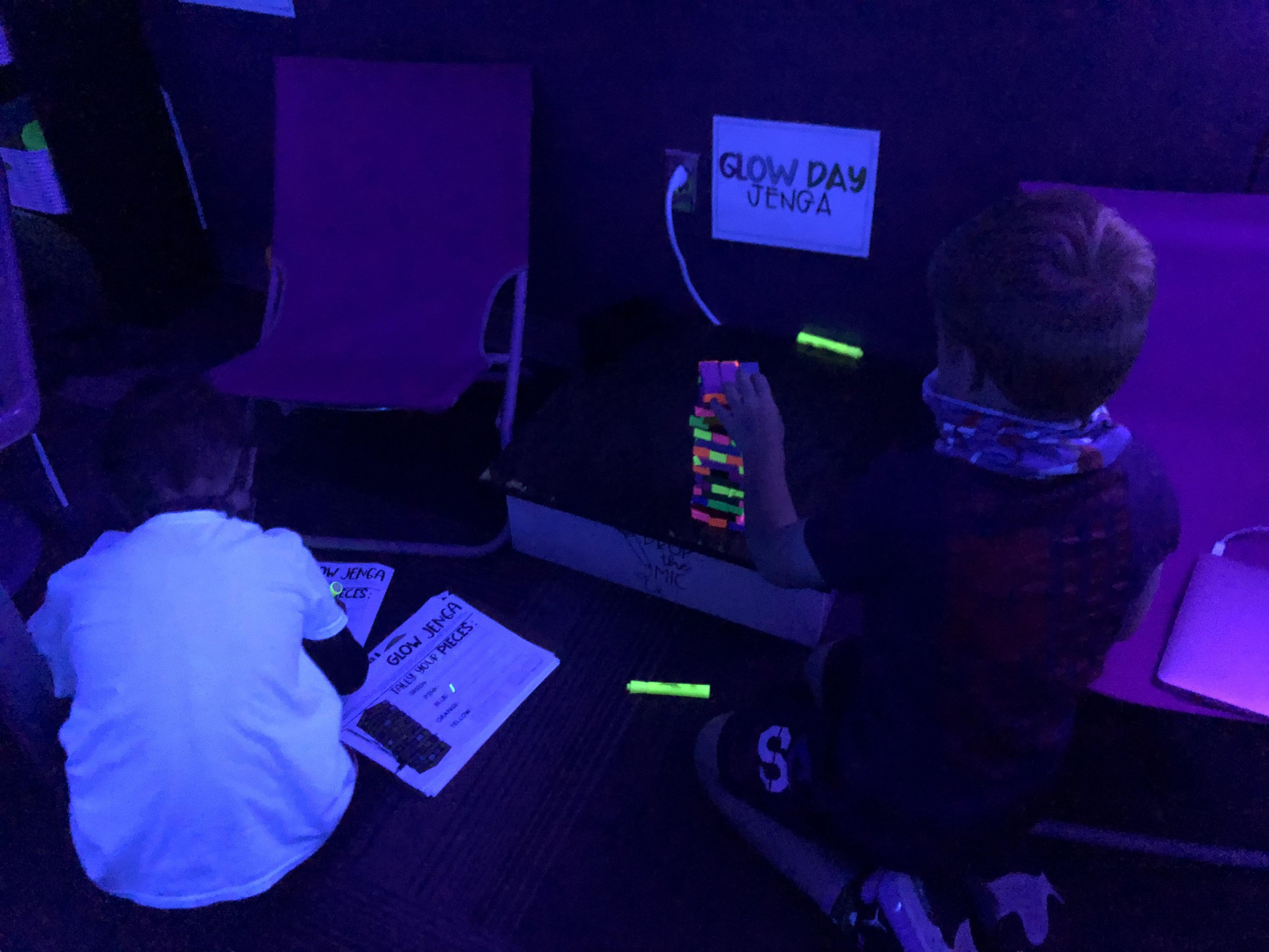 Glow day centers/math: Jenga. Students played glow in the dark Jenga. Then made a graph of how many of each color block they had once the tower fell.