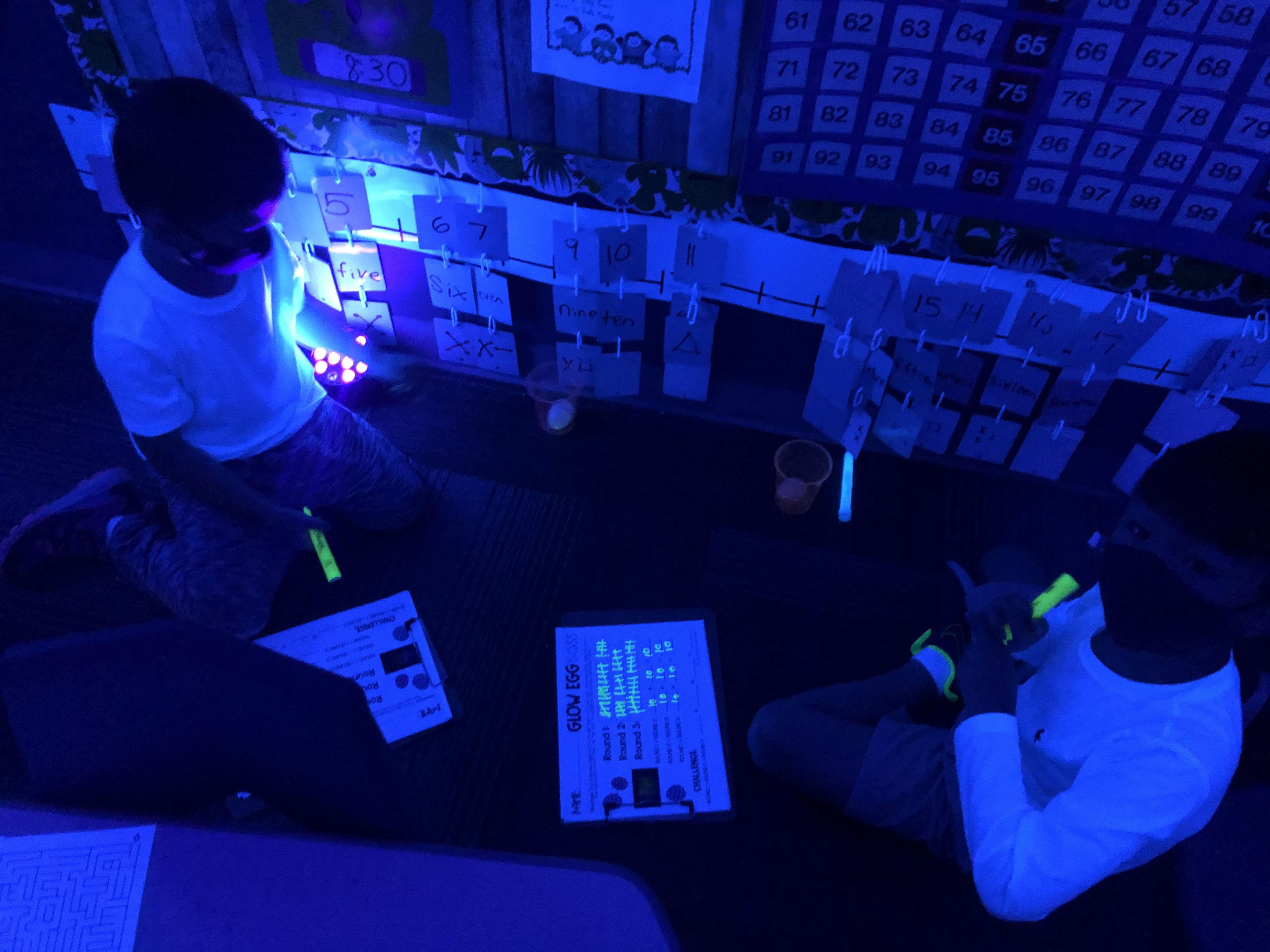 Glow Day Centers/Math: egg toss. Tally and add how many times you can toss a glowing egg into a cup/