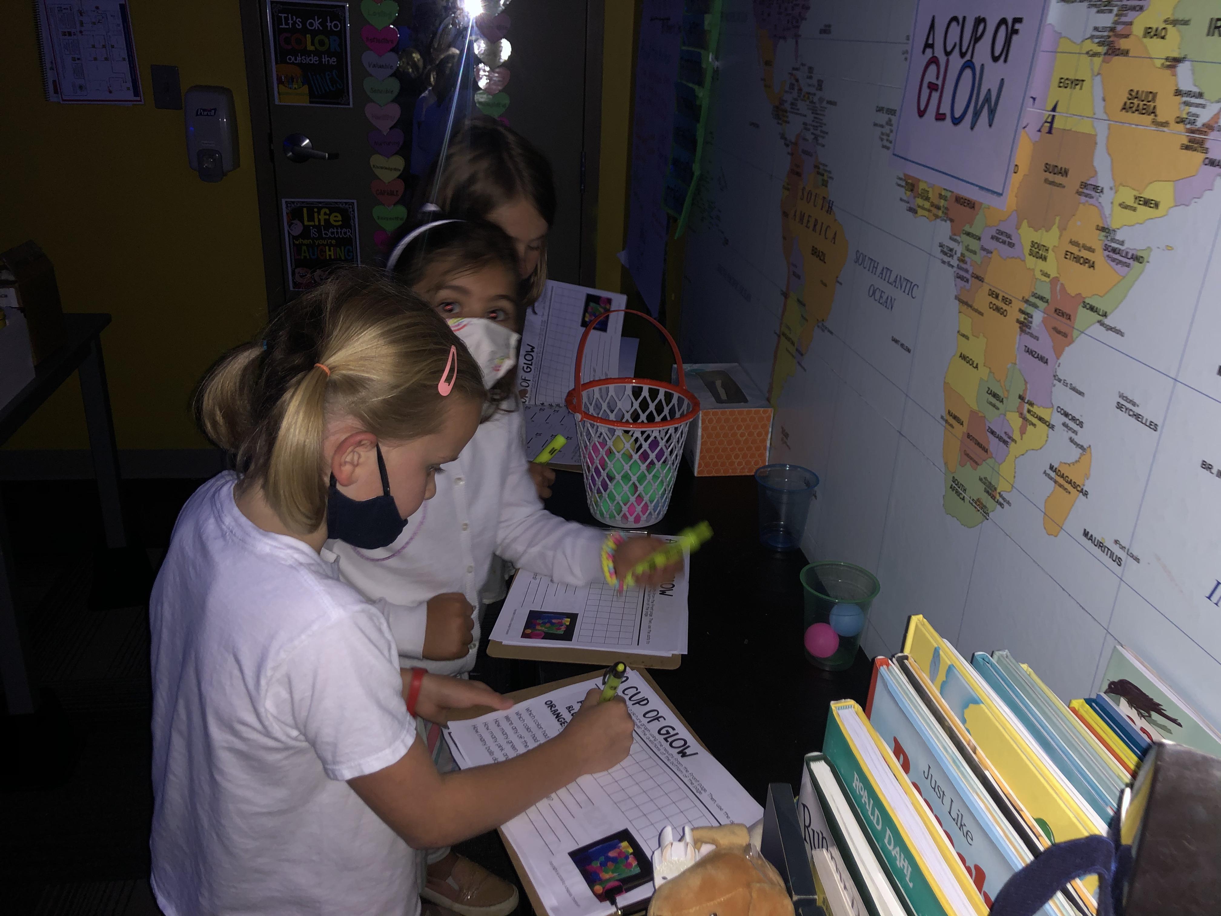 Glow day centers/Math: cup of glow: students tossed neon ping-pong balls into a cup and then used their cup to create a graph.