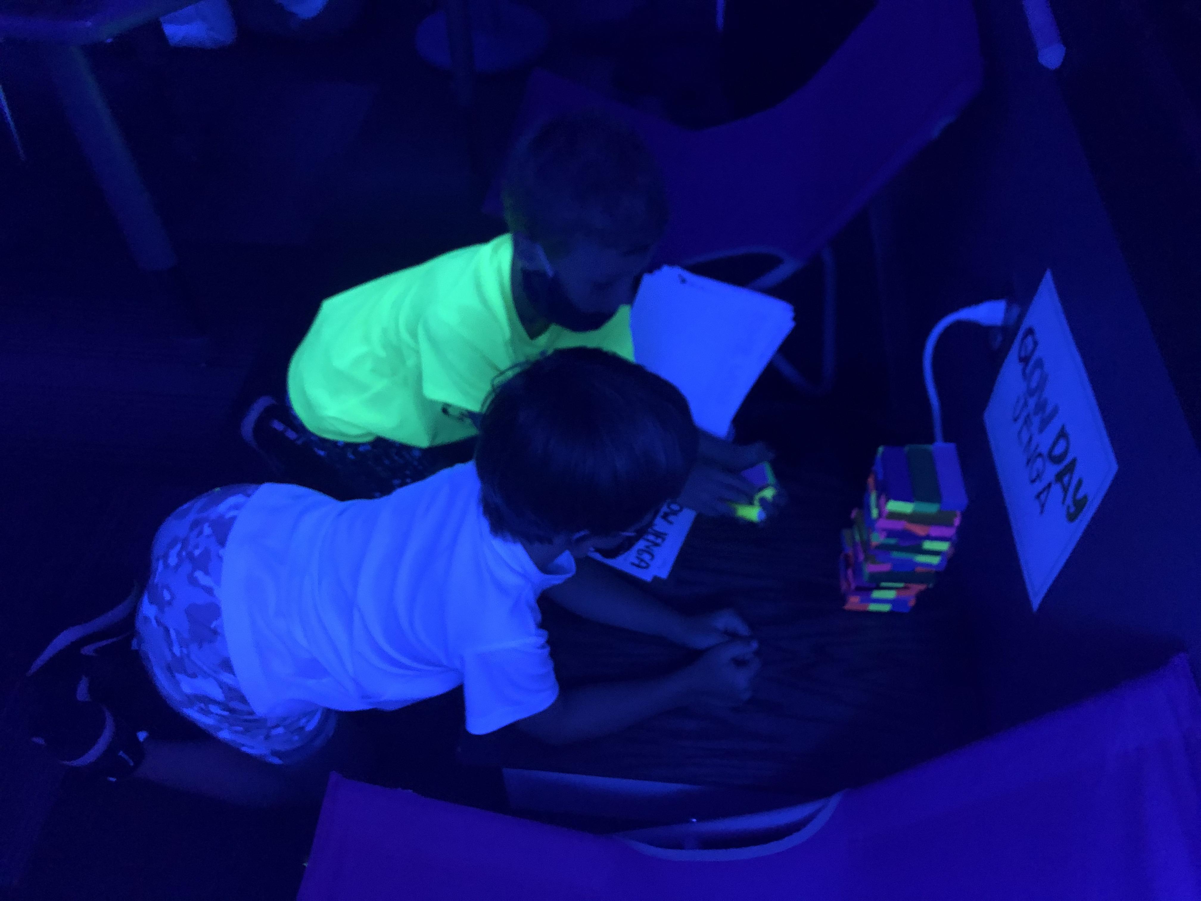 Glow day centers/Math: Jenga. Students played glow in the dark Jenga then created a graph to show how many of each color block they had once the tower fell.