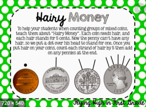 This week we have learned the "Hairy Money" strategy to counting coins. Tonight, have your child show you how to count coins in this way.